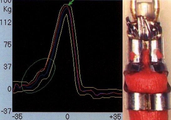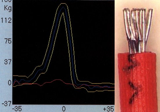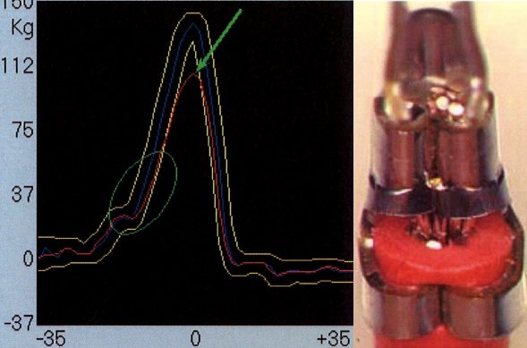 If the machine cut wire conductor more than 10% when stripping a wire insulation by blade, the crimping pressure is lower. Then the curve is displayed lower at the top